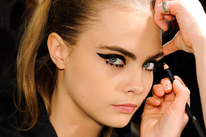 The 60’s influenced look at Anna Sui was created by Pat McGrath who gathered inspiration from women like Chantal Goya, Brigitte Bardot and Anna Karina. Models were given a graphic, black cat eye that extended out to the end of their eyebrow. Their waterlines were painted white and tons of mascara was added to the bottom lashes to give it the piece-y, separated look.