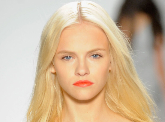 Key makeup artist, Bobbi Brown, created the look for the J Mendel runway show. Clean, flawless skin and lots of mascara, topped off with bright orange lips!